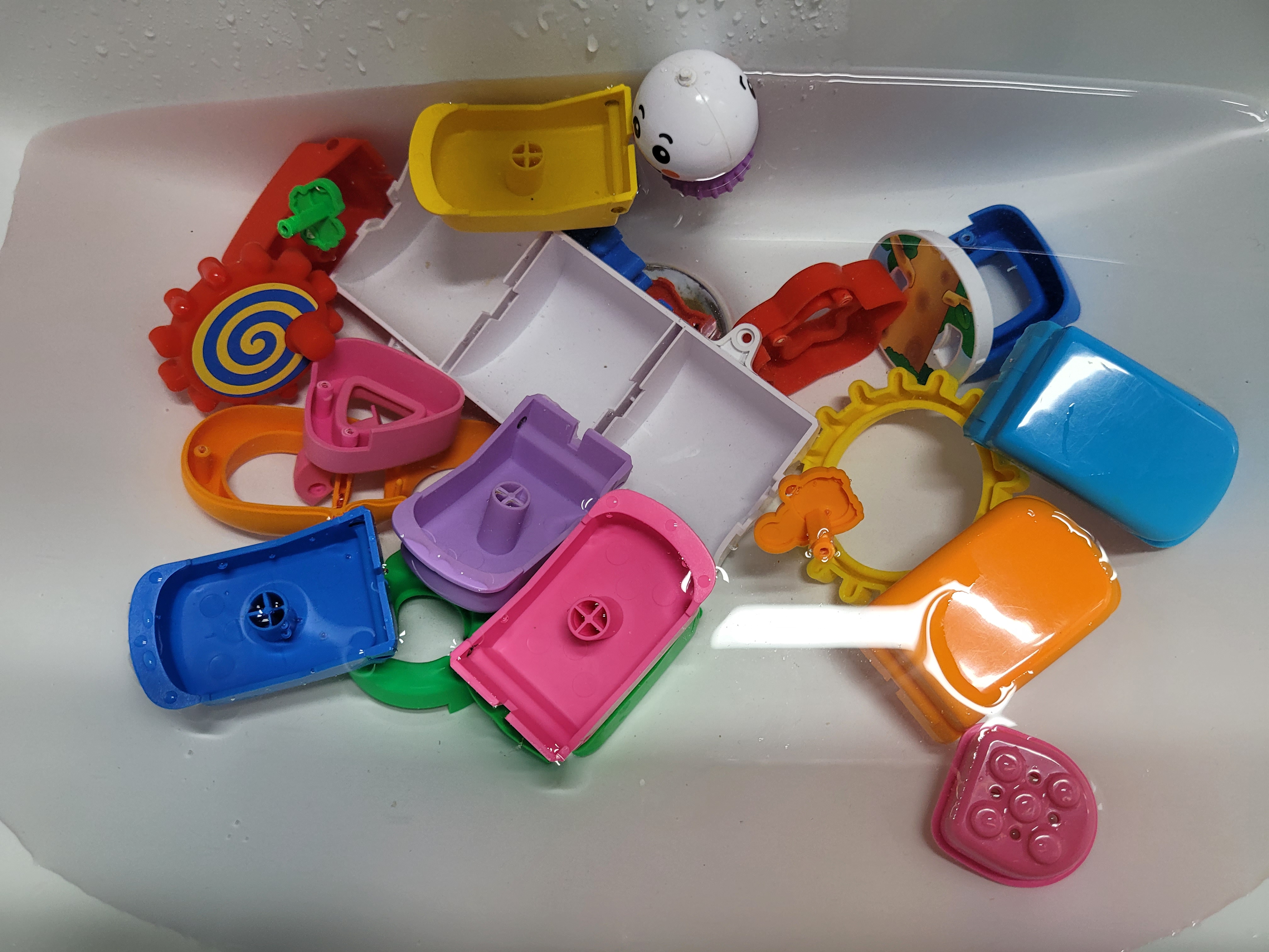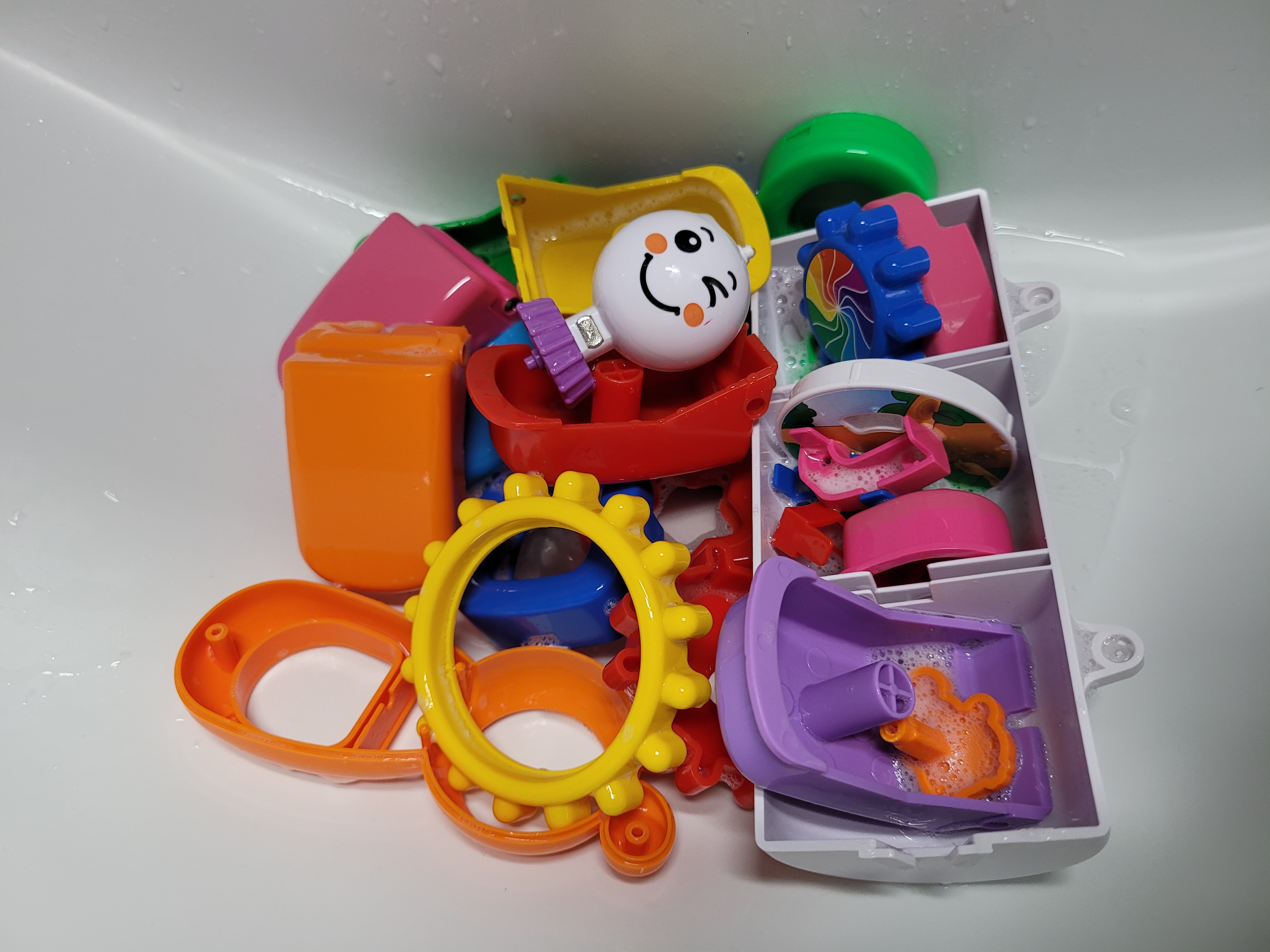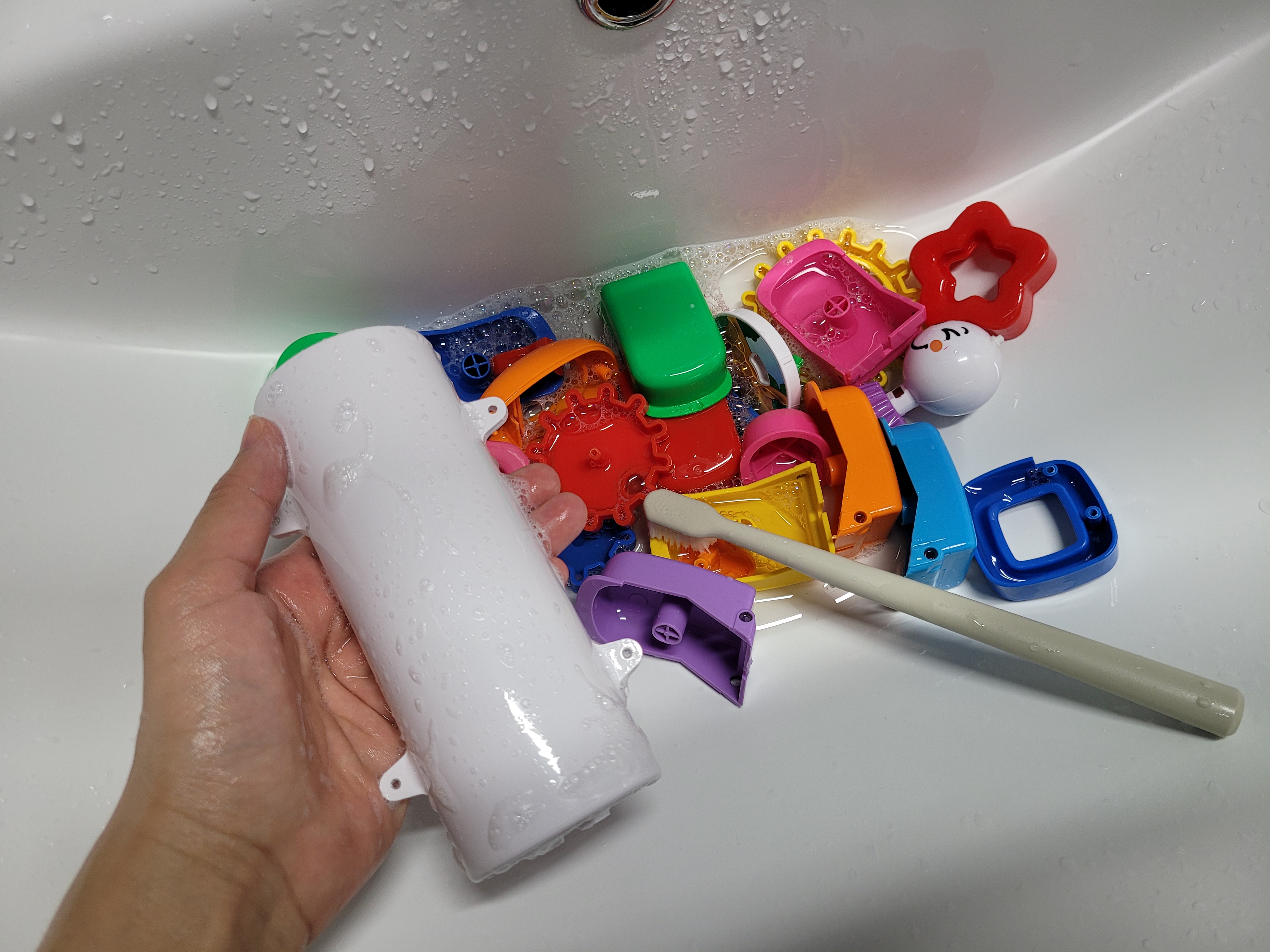 각각의 조각들을 세면대로 가져가서 젖병세정제로 칫솔로 닦고 물로 깨끗이 씻어준다